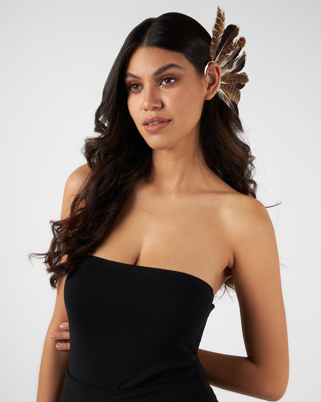 The Ayana feather ear cuff is a unique accessory that will enhance your outfit.