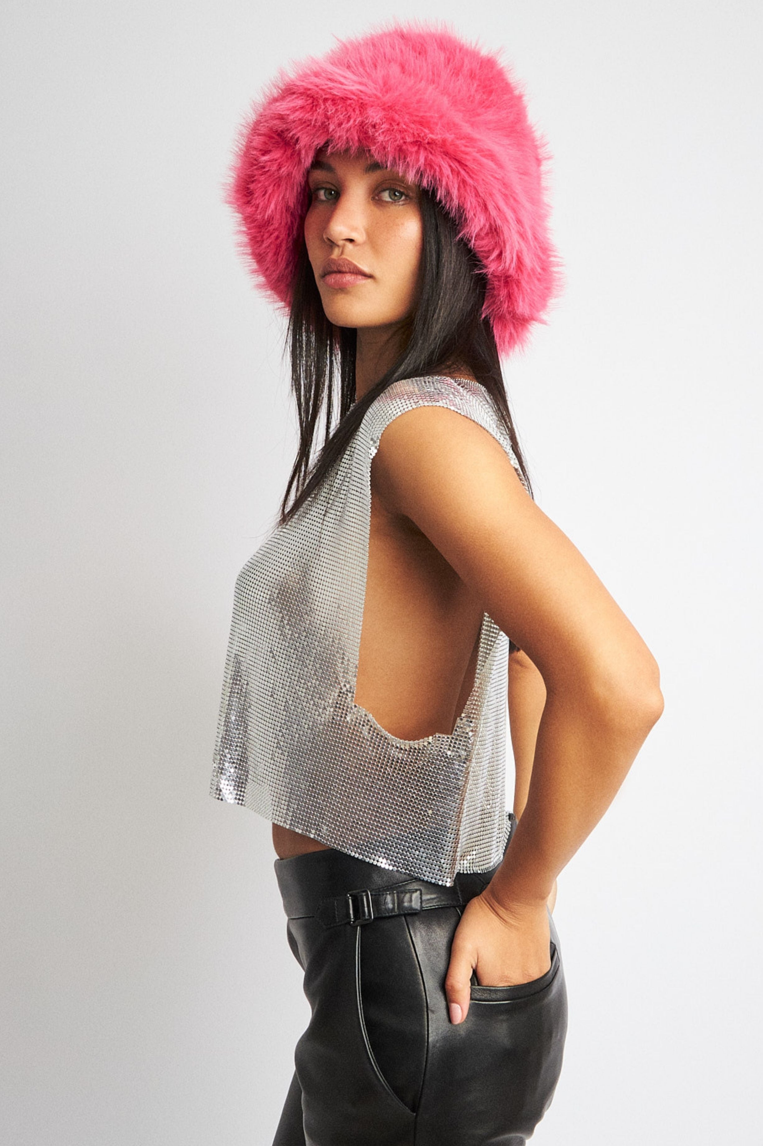 With its irresistibly soft texture, this furry hat is the ideal finishing touch to any look. Designed to offer warmth and complement any wardrobe, from casual outdoor wear to evening attire.