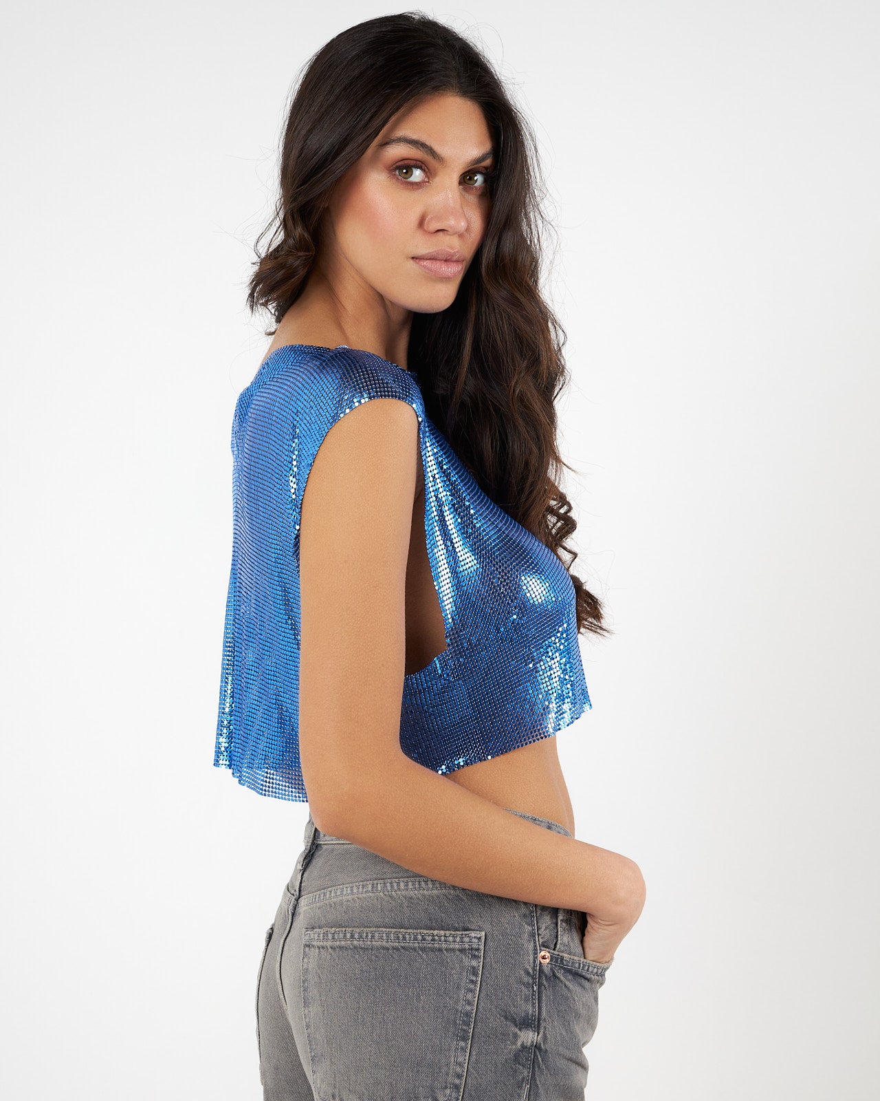 Shiny blue mesh blouse