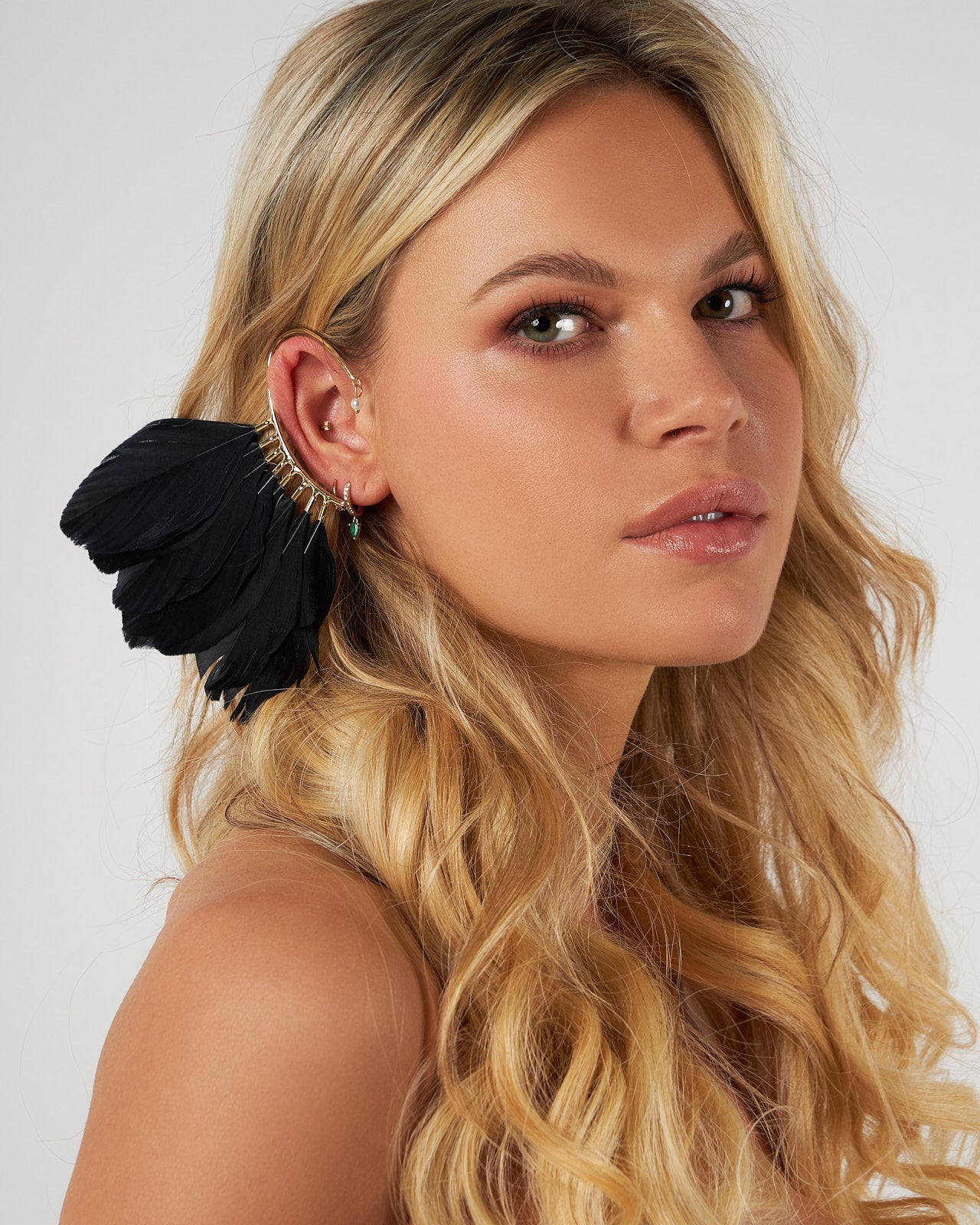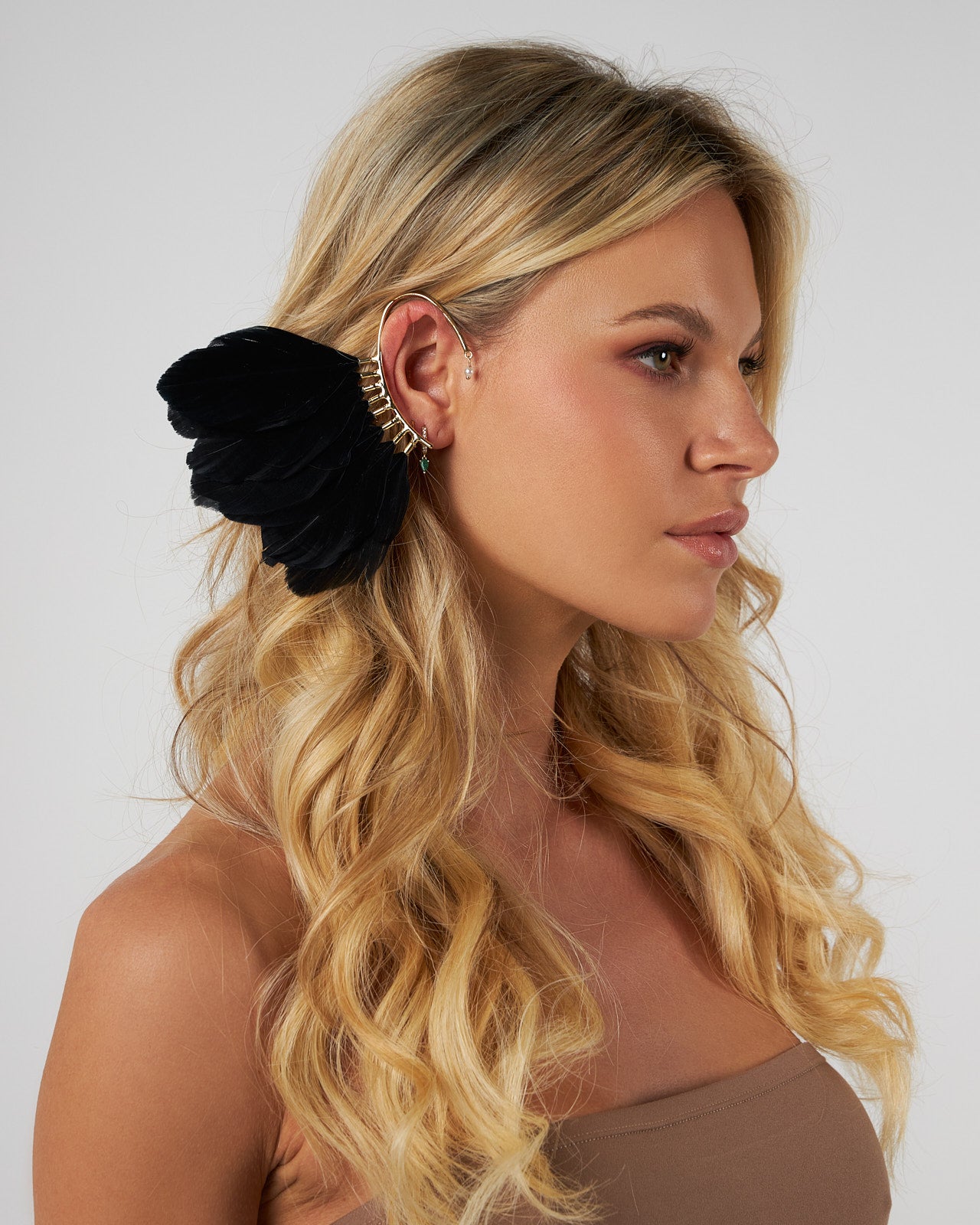 The Soraya feather ear cuff is a unique accessory that will enhance your outfit.