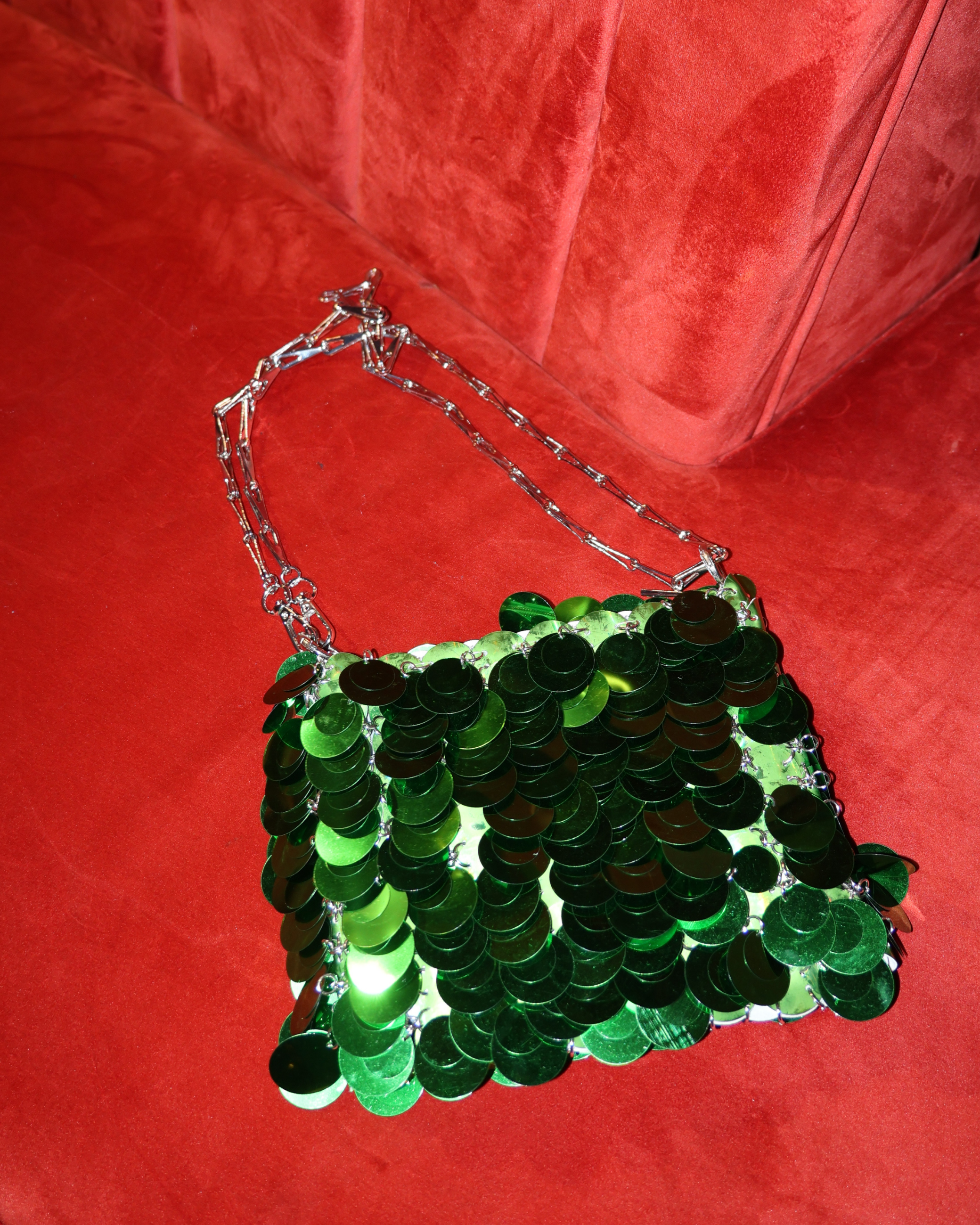 The Iris Bag is crafted with double-layer paillettes of different sizes that create a striking reflective effect. Designed with a rectangular shape and a functional chain strap, it can be styled in multiple ways – over the shoulder, cross-body, or carried by hand.