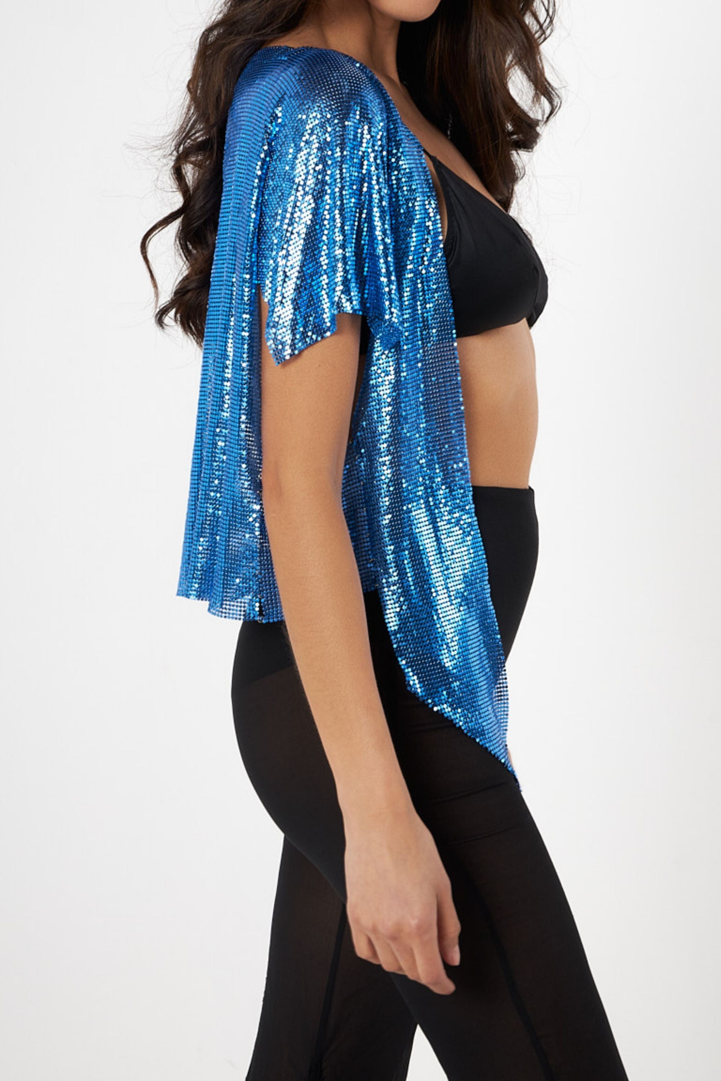 Shiny electric blue metal mesh cardigan top