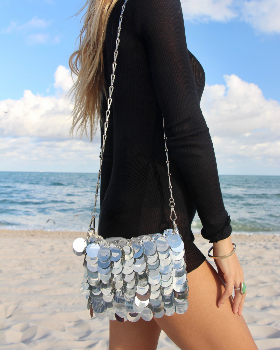 The Iris Bag is crafted with double-layer paillettes of different sizes that create a striking reflective effect. Designed with a rectangular shape and a functional chain strap, it can be styled in multiple ways – over the shoulder, cross-body, or carried by hand.